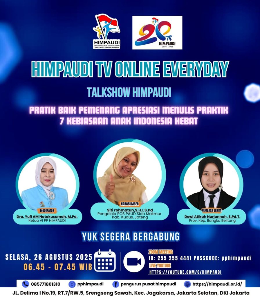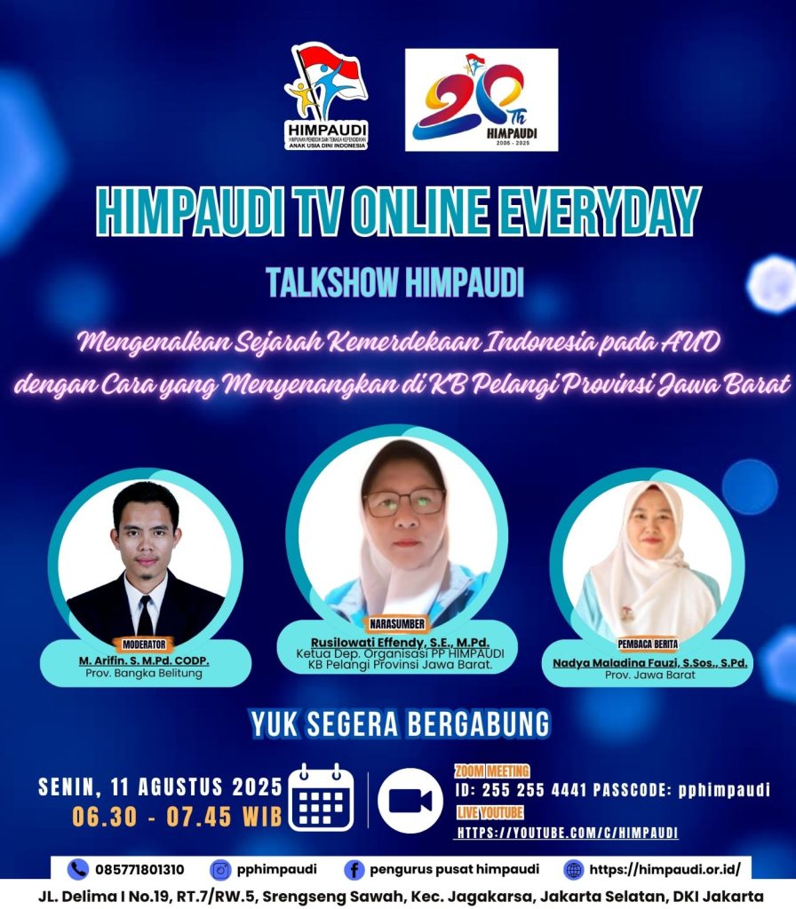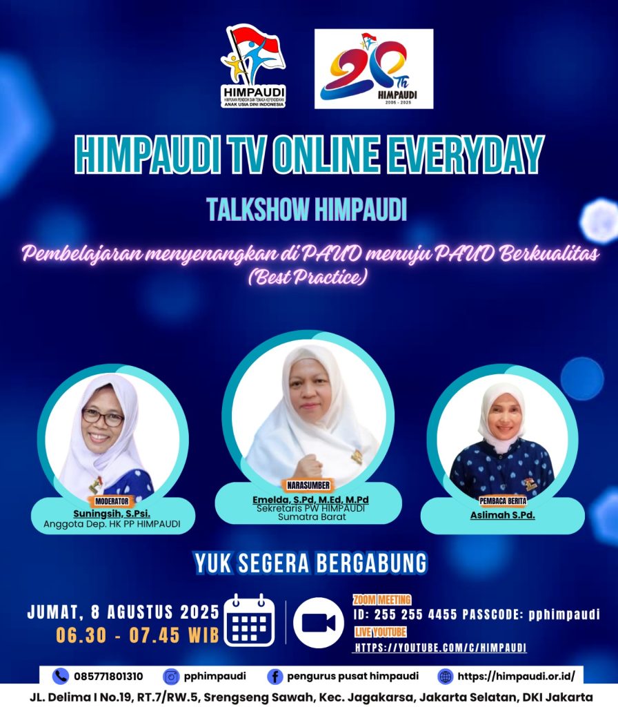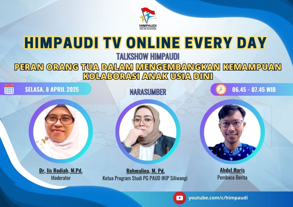 Talkshow HIMPAUDI dengan Tema Strategi Kolaborasi Orang Tua dan Guru dalam Mengembangkan Kemandirian Anak Usia Dini di HIMPAUDI TV Online Everyday pada:
