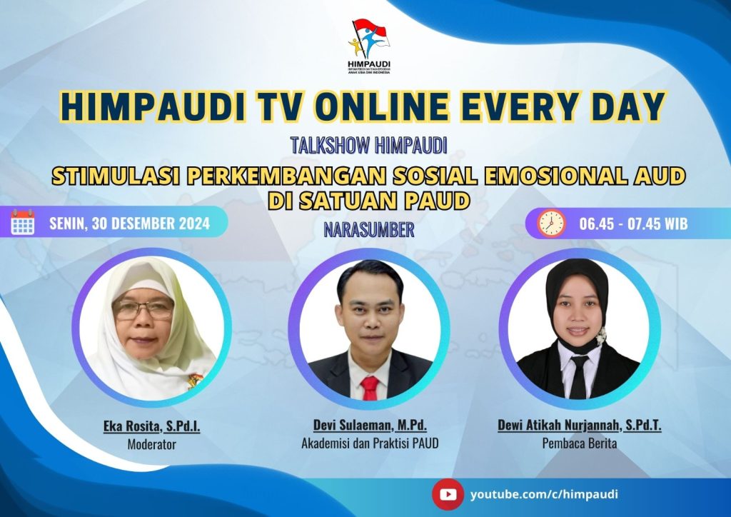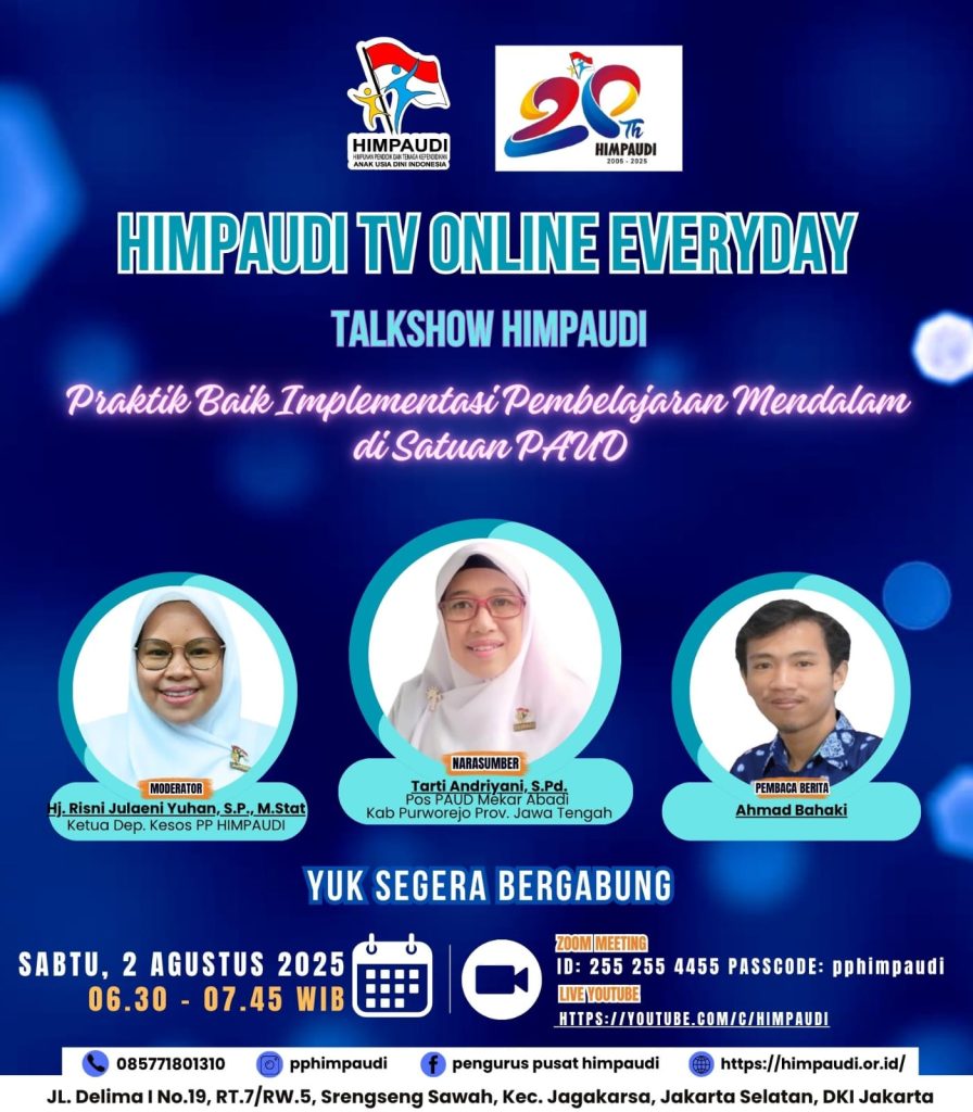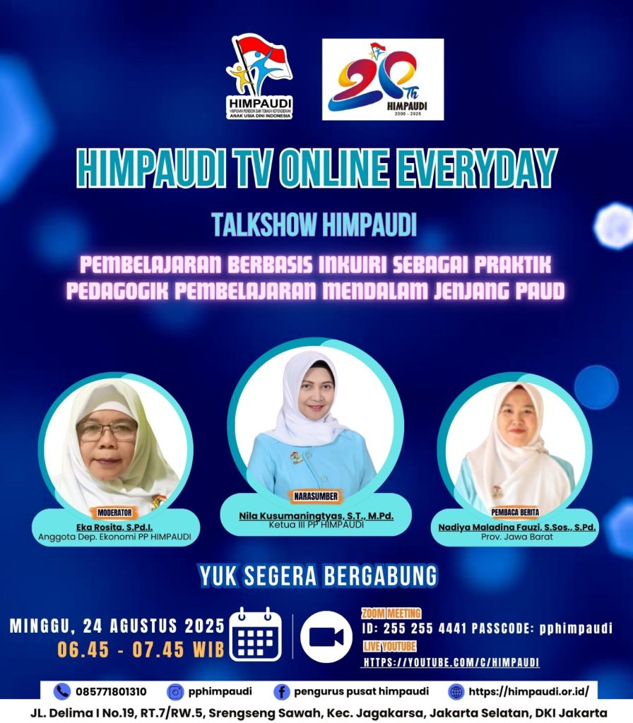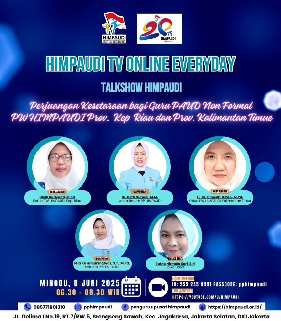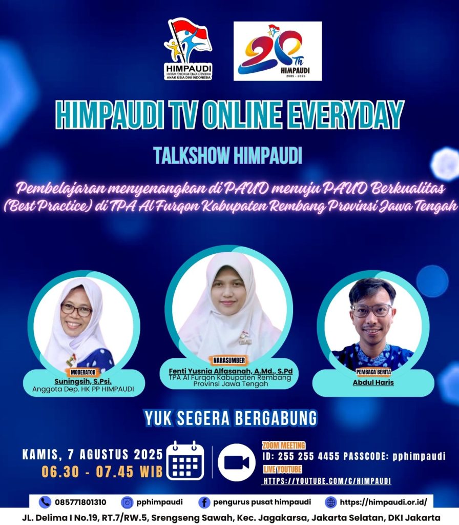 Talkshow HIMPAUDI dengan Tema Strategi Kolaborasi Orang Tua dan Guru dalam Mengembangkan Kemandirian Anak Usia Dini di HIMPAUDI TV Online Everyday pada: