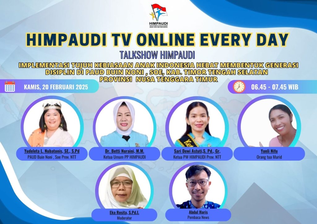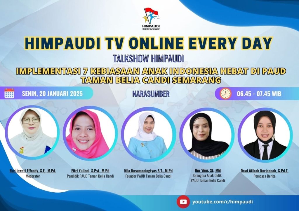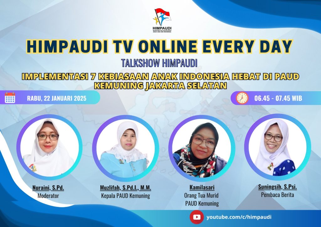 Talkshow HIMPAUDI dengan Tema Implementasi 7 Kebiasaan Anak Indonesia Hebat – Implementasi Kebiasaan Bermasyarakat di HIMPAUDI TV Online Everyday pada: