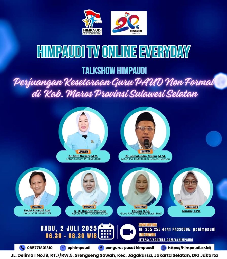 Talkshow HIMPAUDI dengan Tema “Guru Profesional, Wujudkan Karakter Kuat, Menuju Indonesia Bermartabat” di HIMPAUDI TV Online Everyday pada: 📆 Hari : Senin 🗓Tanggal : 26 Agustus 2024 ⏰Waktu : Pukul 06.45-08.00 Wib