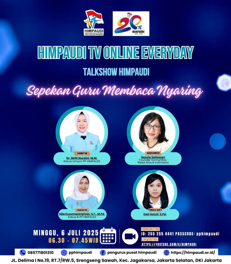 Talkshow HIMPAUDI SEPEKAN BERSAMA HIMPAUDI TV DALAM PERINGATAN HARI STORYTELLING DUNIA 2025 dengan Tema Menanamkan 7 Kebiasaan Anak Indonesia Hebat melalui Story Telling di HIMPAUDI TV Online Everyday pada: